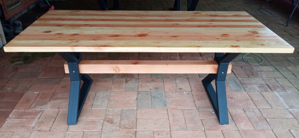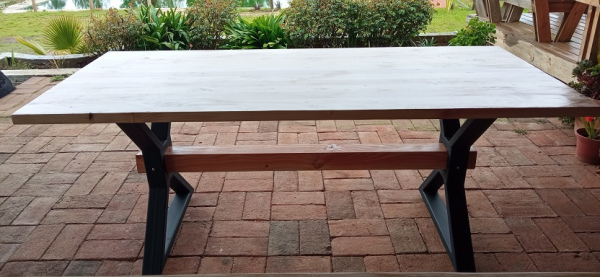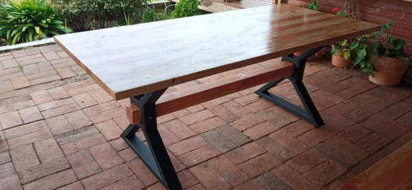 Mesa de comedor en acero y pino oregón. Moderno diseño que combina lo rústico con la elegancia. Las terminaciones son: Acero negro mate y cubierta vitrificada. Sus dimensiones son: 190 x 90 x 4 cm
